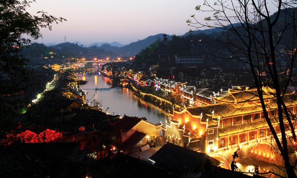 "一座青山抱古城,一湾沱水绕城过"。 横亘古城的南华山被誉为凤凰的父亲山,碧水逶迤的沱江是凤凰的母亲河。南华山国家森林公园位于凤凰古城南部,临沱江之畔,呈月牙形环抱凤凰古城,神凤文化景区就位于南华山国家森林公园境内,景区入口毗邻虹桥,依山傍水,俯瞰整个凤凰古城。