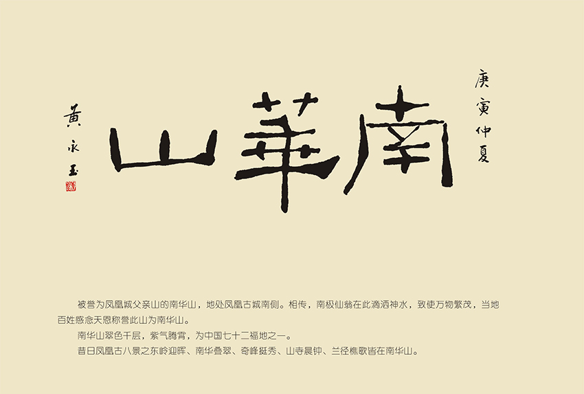 南华山国家森林公园景区从徽标设计到景区景点的规划、设计、建设和展示的五十多幅书法作品,均由黄永玉大师全程指导,手绘蓝图,亲书题写,可以说,这是黄永玉大师在他的故乡大地上描绘的一幅传世艺术巨著。